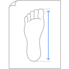 Em um papel, desenhe o contorno dos seus pés descalços. Meça do dedão até o calcanhar.