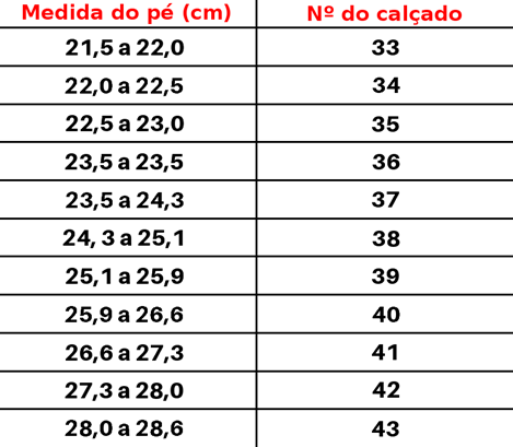 Verifique as medidas do seu pé de acordo com a tabela abaixo para evitar erro de numeração.