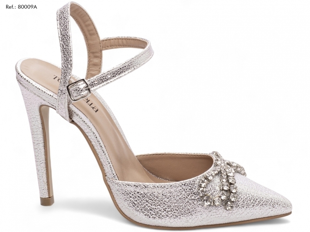 Palmilha: 8 mm de Espessura, Espuma em EVA, Revestida em Napa Metalizado Prata e Taloneira Napa Bege;